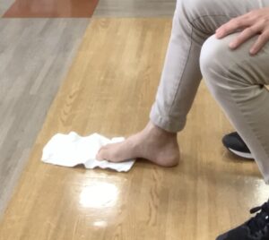 足の指を使って、タオルを少しずつ手前に引き寄せるようにたぐり寄せます。