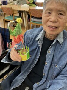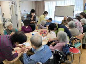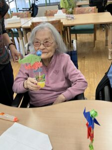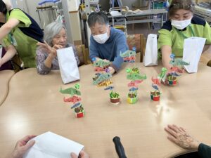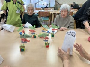 色とりどりの折り紙を手に、「この色がいいね」「昔よく折ったね」と会話も弾み、和やかなひとときに。指先を使いながら、完成した作品を見て皆さま自然と笑顔がこぼれていました。