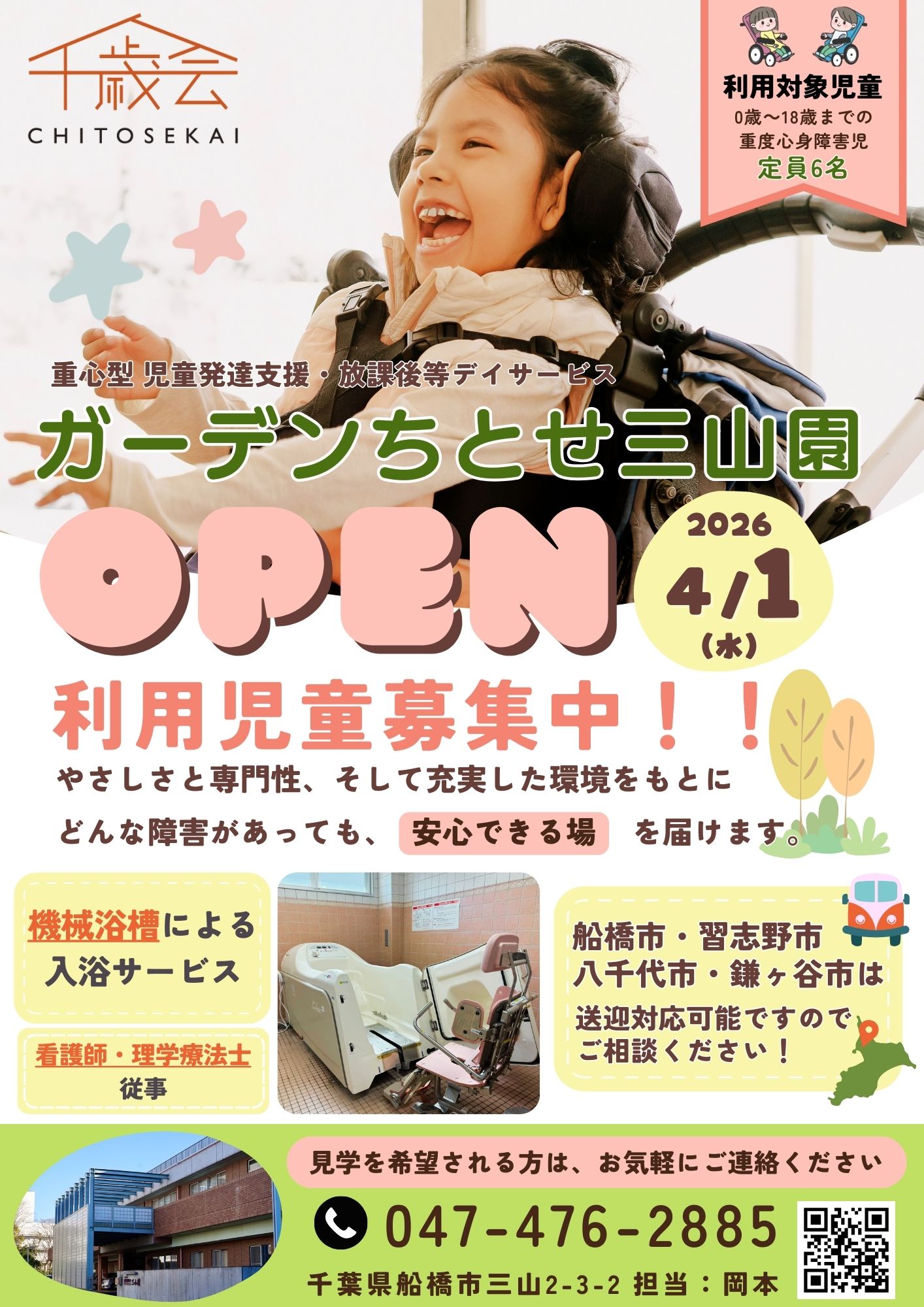 特別養護老人ホーム三山園の敷地内に、重度心身障害児に特化した児童発達支援・放課後等デイサービス『ガーデンちとせ三山園』が2026年4月1日に開設予定です。